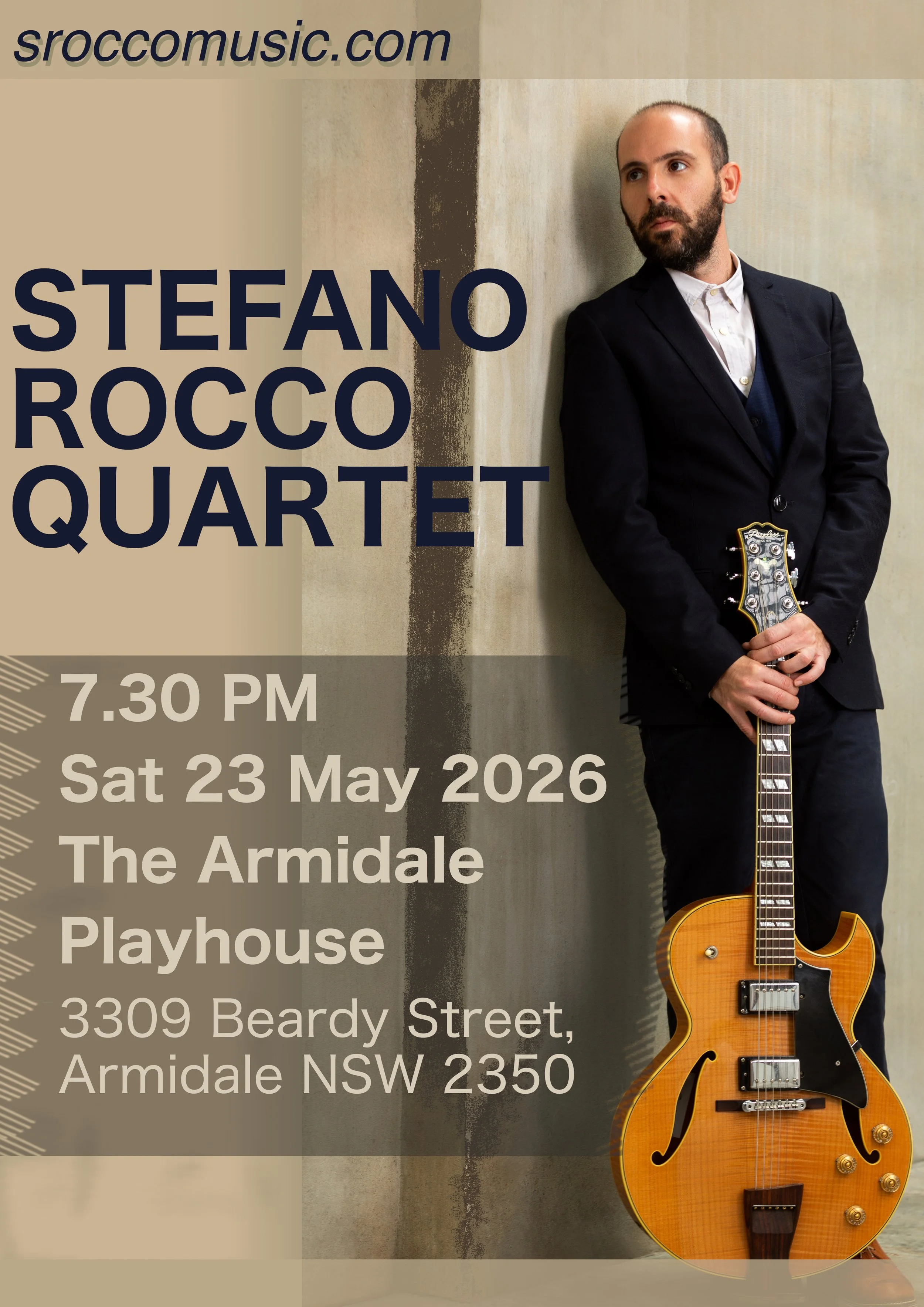 Italian-born, Sydney-based guitarist and composer Stefano Rocco leads the Stefano Rocco Quartet, presenting original music at the crossroads of modern jazz and cinematic atmosphere.