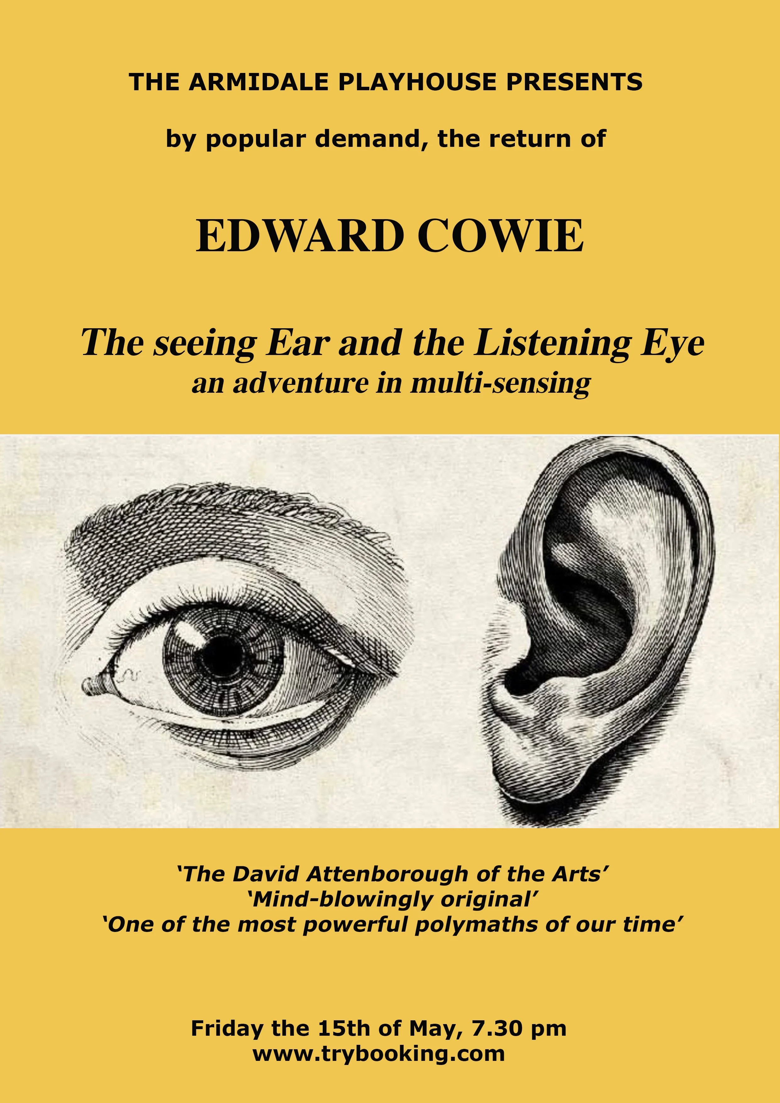 Edward Cowie - composer, performer, visual artist, natural scientist, writer film-maker and broadcaster returns to the Armidale Playhouse to share a new 'adventure in thinking and sensing'. Edward will show us that our prime senses of seeing and hearing are in fact deeply connected.